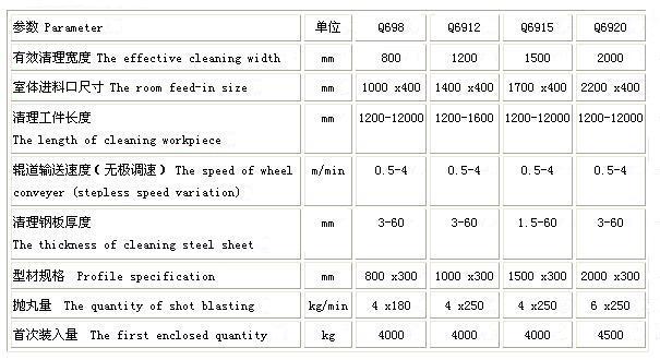 产品型号:Q698、Q6912、Q6915、Q6920 该系列钢板、型材抛丸预处理线主要由预热、抛丸处理、喷漆烘干工序组成。适用于船舶、汽车、机车车辆、桥梁、机械等行业的钢板、型材及结构件的表面除锈、涂漆工艺。